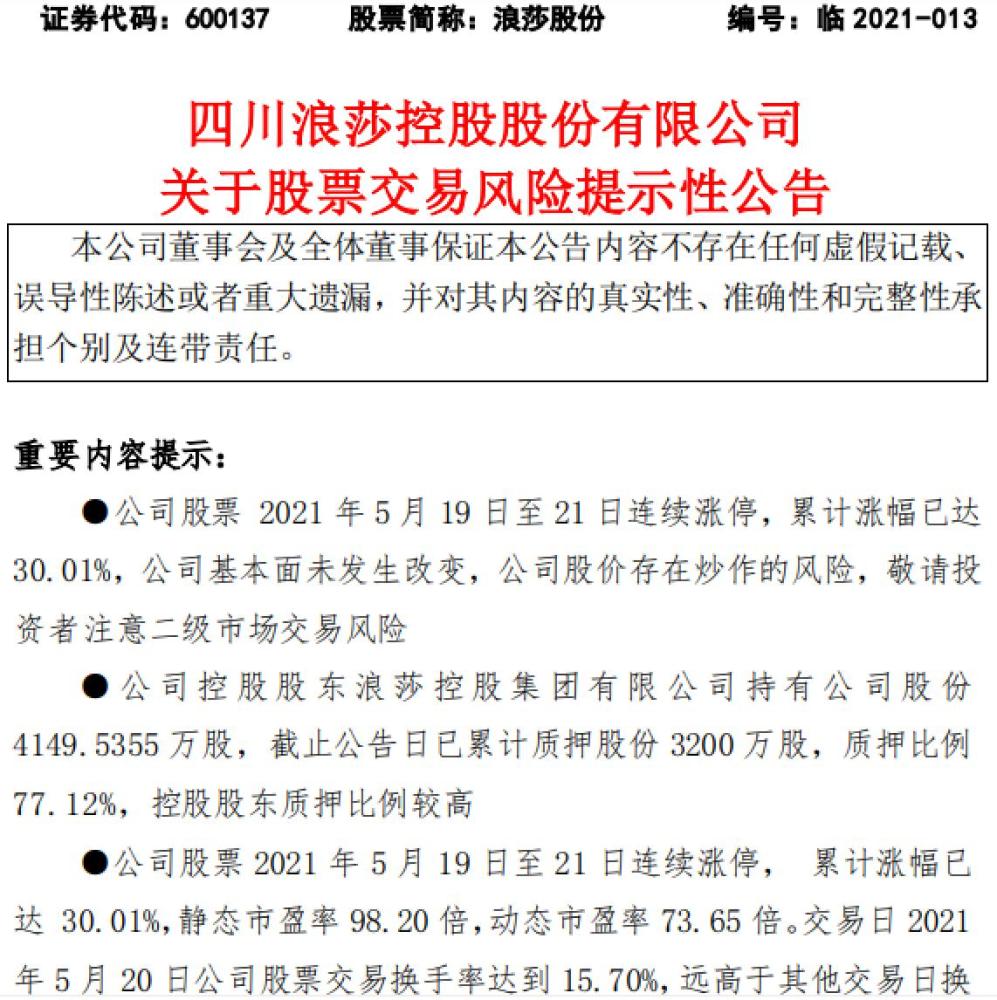 5月22日,浪莎品牌旗下上市公司浪莎股份(600137.SH)发布公告称,经营盈利能力不高,股价存在炒作风险。