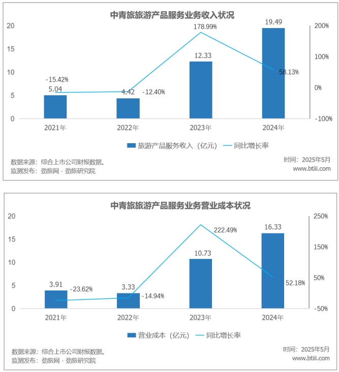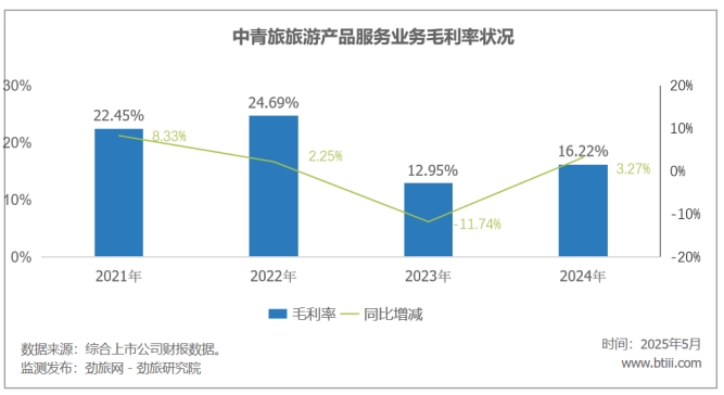 旅游产品服务业务收入为19.49亿元,同比增长58.13%。营业成本为16.33亿元,同比增长52.18%。毛利率为16.22%,同比增长3.27个百分点。