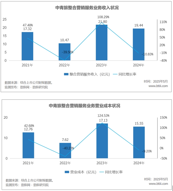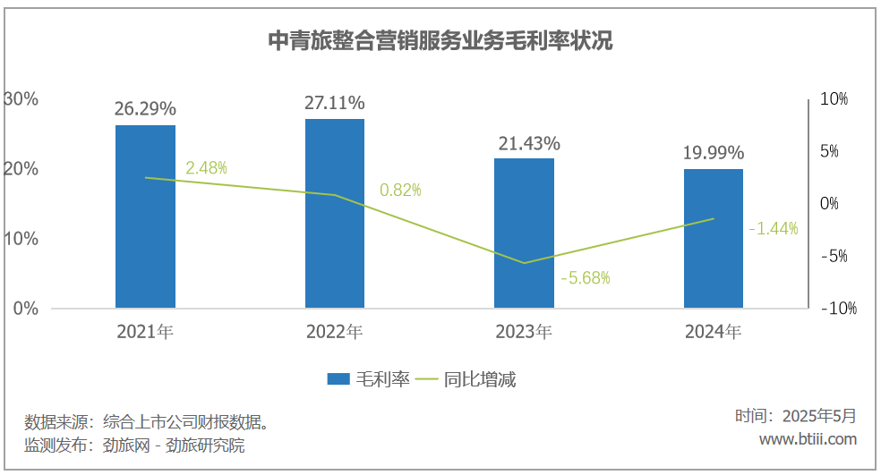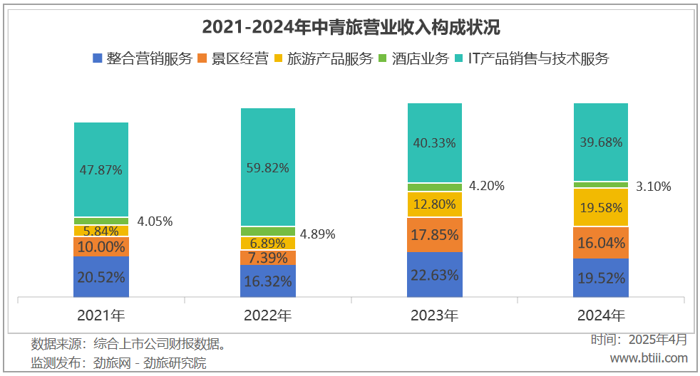 2024年主营业务方面,整合营销服务、景区经营、旅游产品服务、酒店业务、IT产品销售与技术服务收入占比分别为19.52%、16.04%、19.58%、3.10%、39.68%。