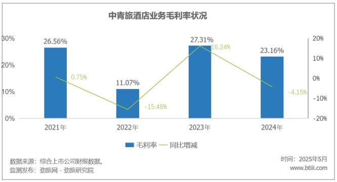 酒店业务收入为3.08亿元,同比下降23.82%。营业成本为2.37亿元,同比下降19.47%。毛利率为23.16%,同比下降4.15个百分点。