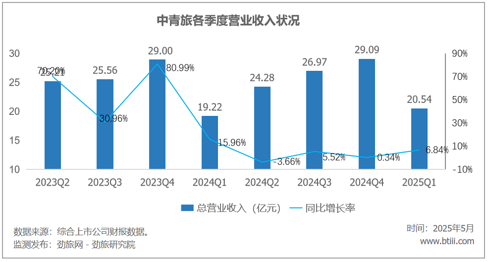 报告显示,中青旅一季度收入20.54亿元,上年同期收入为19.22亿元,同比增长6.84%。
