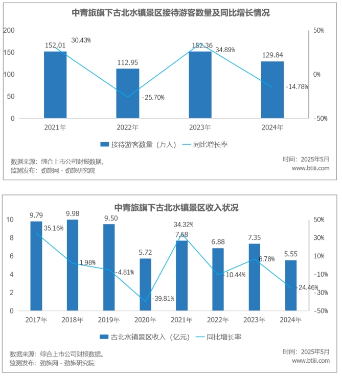 中青旅旗下古北水镇2024年接待游客数量为129.84万人次,同比下降14.78%。营业收入为5.55亿元,同比下降24.26%。