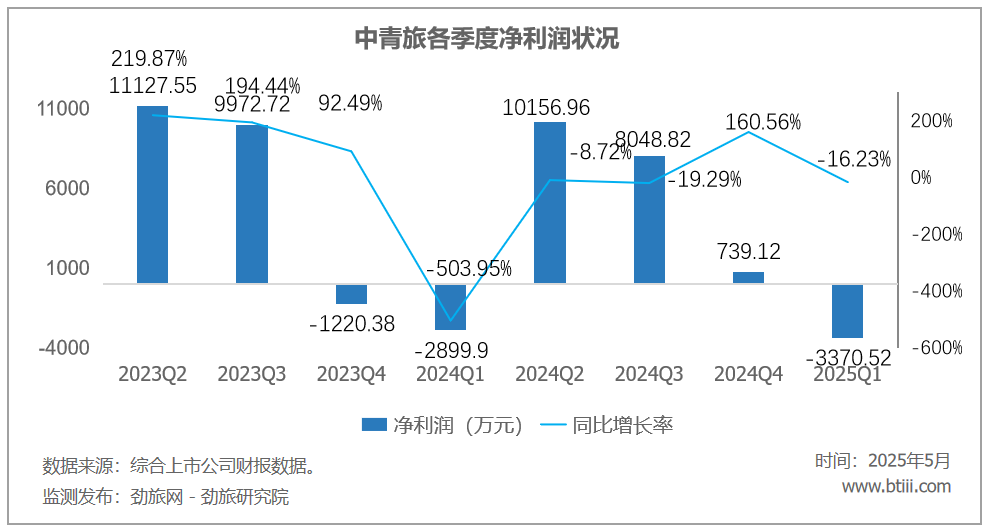 中青旅一季度净利润亏损3370.52万元,上年同期为亏损503.95万元,同比增亏16.23%。