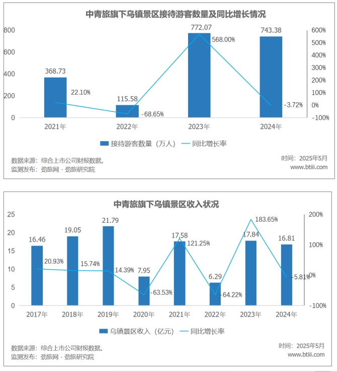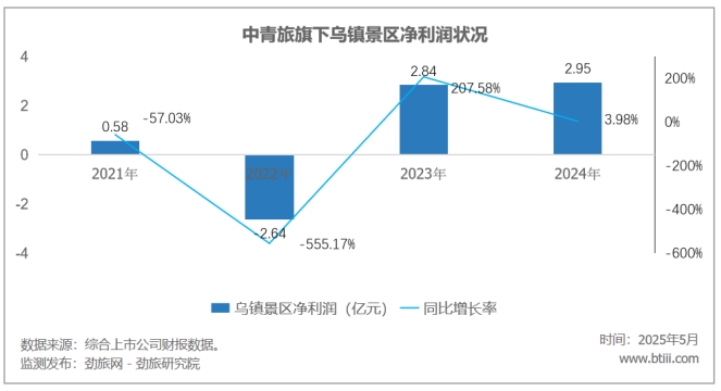 2024年,中青旅旗下乌镇景区接待游客数量为743.38万人次,同比下降3.72%。营业收入为16.81亿元,同比下降5.81%。净利润2.95亿元同比增长3.98%。