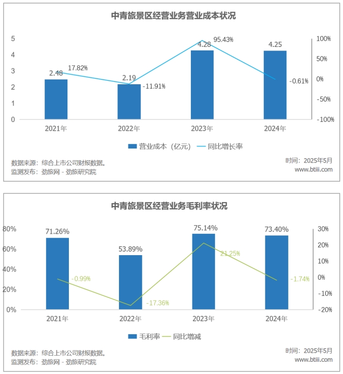 景区经营业务收入为15.97亿元,同比下降7.12%。营业成本为4.25亿元,同比下降0.61%。毛利率为73.40%,同比下降1.74个百分点。