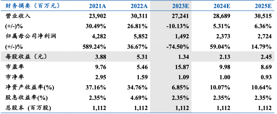 调整盈利预测,维持“买入”评级。预计公司23-25年实现营业收入272.41、286.89、305.15亿元(此前为225.87、282.92、306.62亿元),归母净利润14.92、23.73、27.24亿元(此前为24.81、29.01、33.20亿元),对应 PE 为 16X/10X/9X,维持“买入”评级。