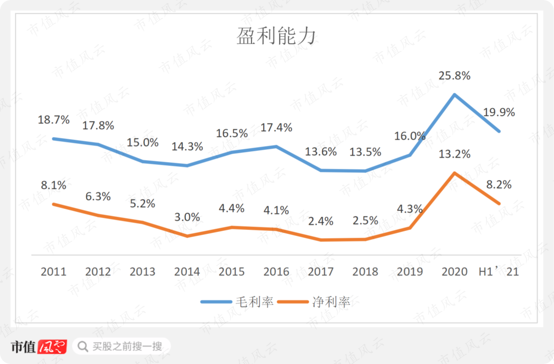 同时,净利率与毛利率高度趋同,也较2020年下降了5个百分点,但从公司历史数据来看,2021年上半年的毛利率和净利率仍是除2020年之外的历史最高水平。