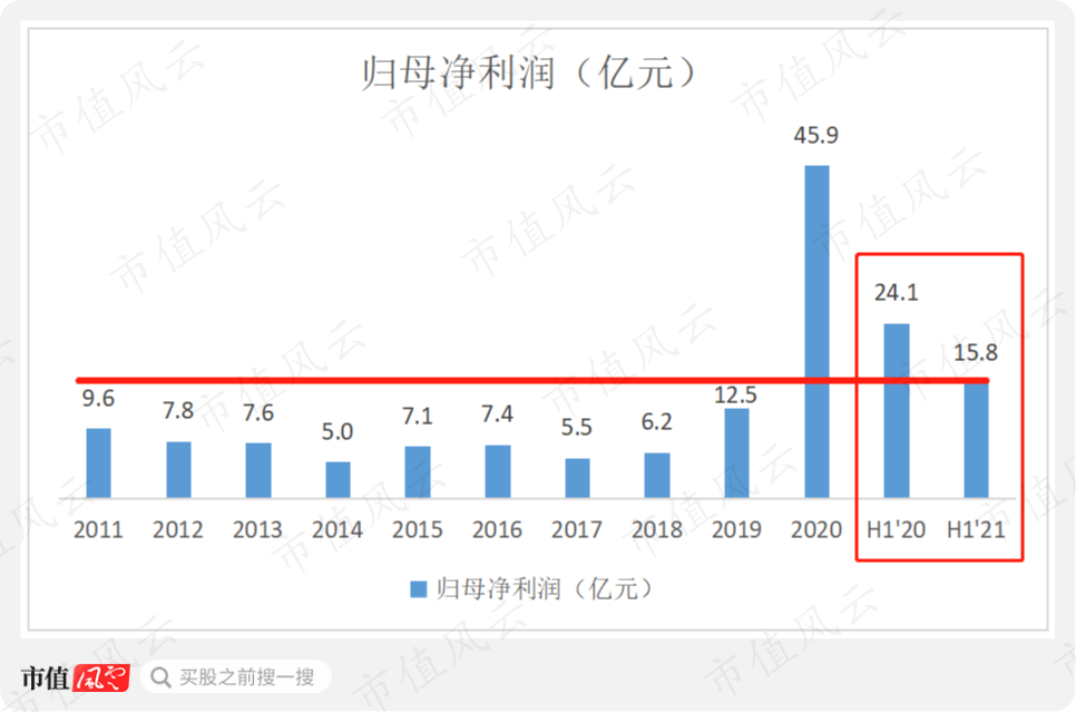 最终,公司2021年上半年实现归母净利润15.8亿,较2020年上半年下降34.44%,不过仍比除2020年之外的其他年份全年利润都要高。
