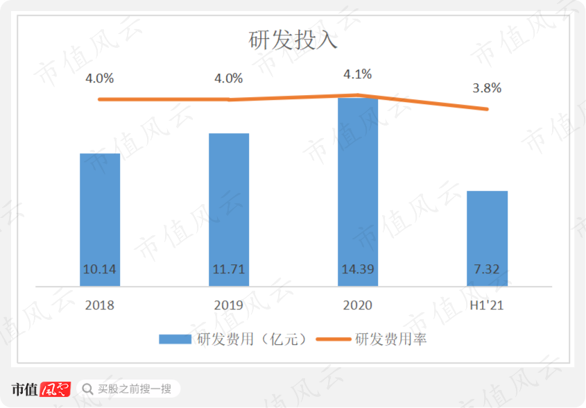 2018-2020年及2021年上半年,公司的研发投入分别为10.14亿、11.71亿、14.39亿和7.32亿,研发投入占营收的比例一直维持在4%左右,在业内也算高标准了。