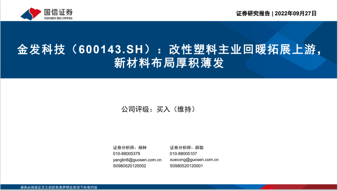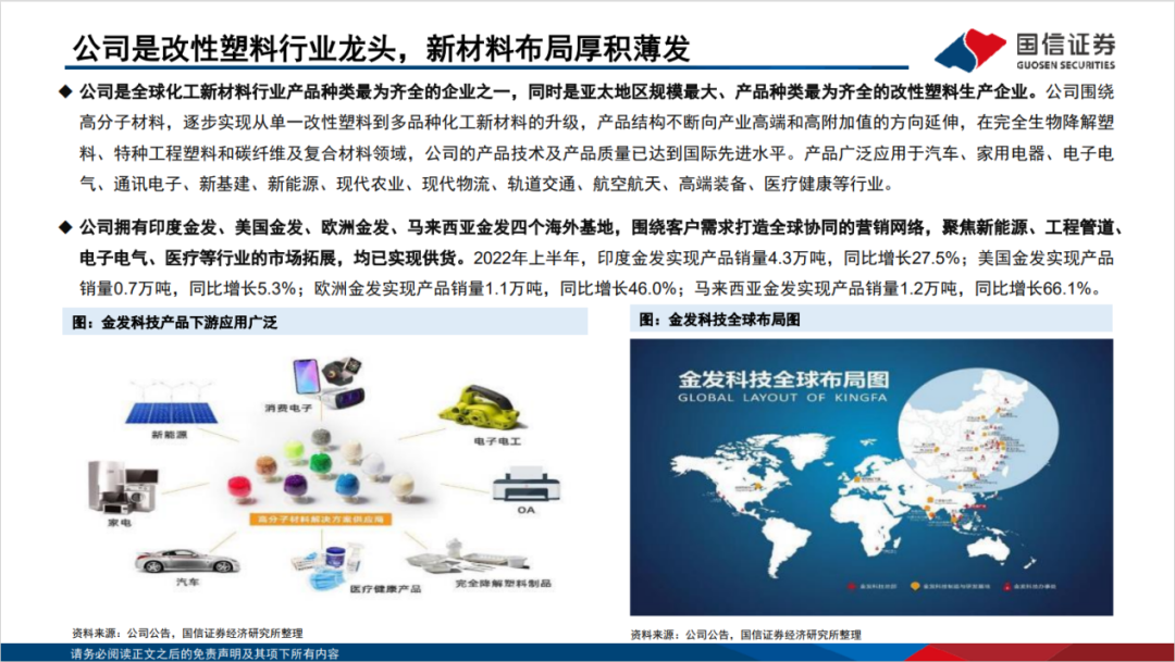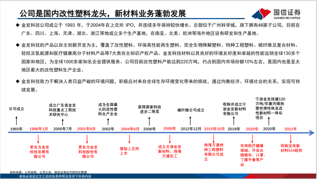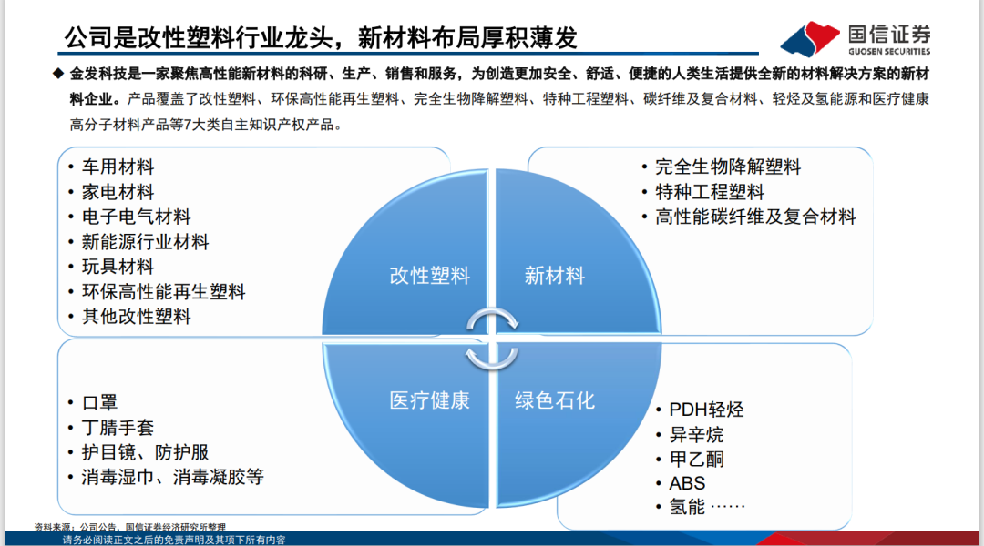 金发科技是全球化工新材料行业产品种类最为齐全的企业之一,同时是亚太地区规模最大、产品种类最为齐全的改性塑料生产企业。公司围绕高分子材料,逐步实现从单一改性塑料到多品种化工新材料的升级,产品结构不断向产业高端和高附加值的方向延伸,在完全生物降解塑料、特种工程塑料和碳纤维及复合材料领域,公司的产品技术及产品质量已达到国际先进水平。产品广泛应用于汽车、家用电器、电子电气、通讯电子、新基建、新能源、现代农业、现代物流、轨道交通、航空航天、高端装备、医疗健康等行业。