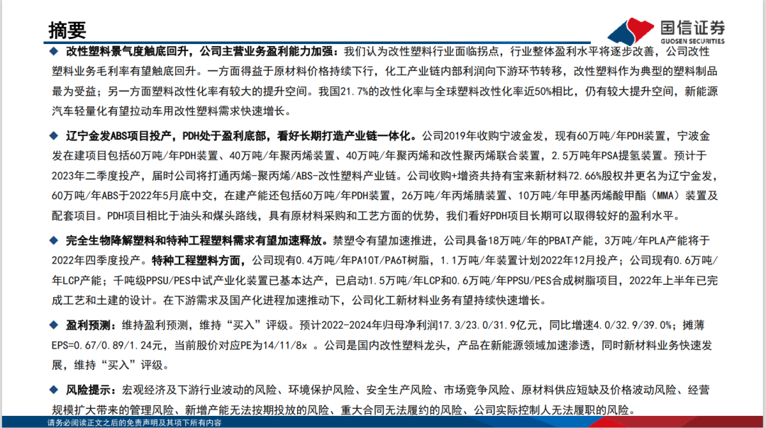 改性塑料、新材料是金发科技重要盈利板块,绿色石化盈利未来有望快速提升。2021年改性塑料贡献63.0%营业收入与74.8%毛利润;新材料业务料更是以6.6%的营收占比贡献了13.5%的毛利润。另外,公司于目前宝来新材料72.66%股权,在建项目包括60万吨/年ABS装置、60万吨/年丙烷脱氢(PDH)装置,26万吨/年丙烯腈(AN)装置、10万吨/年甲基丙烯酸甲酯(MMA)装置及配套项目。其中60万吨ABS及其配套装置项目于5月30日实现工程项目中交,部分产线已开始试生产。