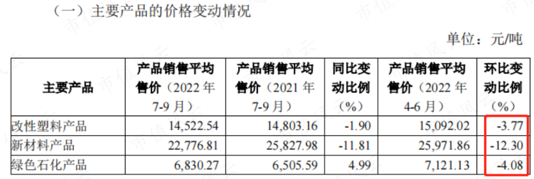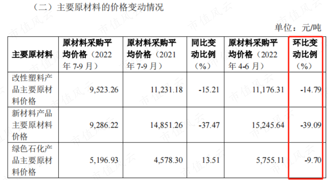 从金发科技披露的主要原材料价格变动情况来看,2022年第三季度,公司主要原材料平均采购价格均出现较大幅度环比下跌,其中改性塑料产品、新材料产品和绿色石化产品的主要原材料价格分别环比下跌15%、39%和10%。