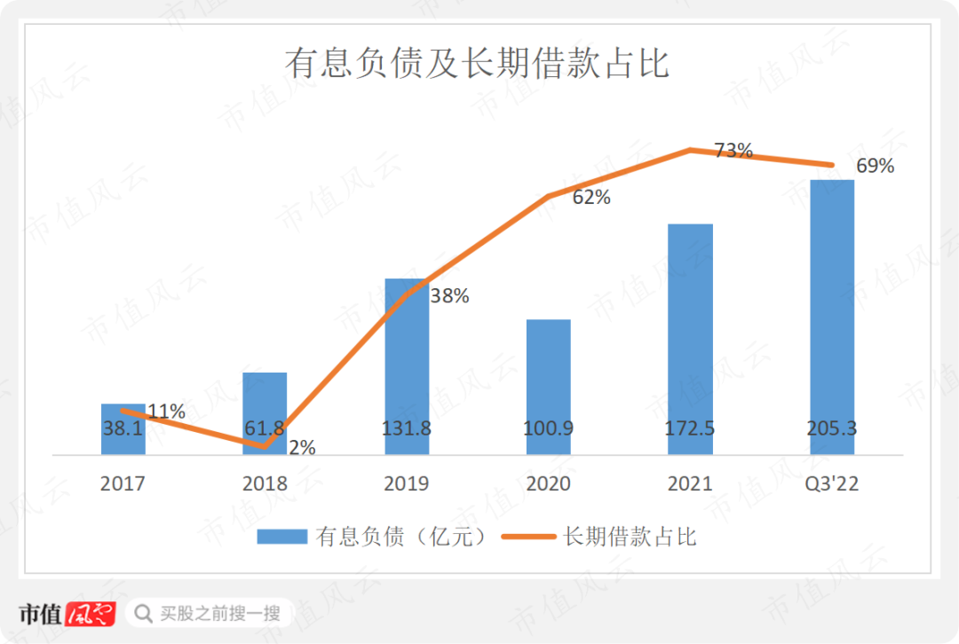 但公司在建巨无霸项目较多也不可避免会导致负债高企,截至2022年三季度末,公司有息负债金额达205.3亿元,是2020年末的2倍左右。