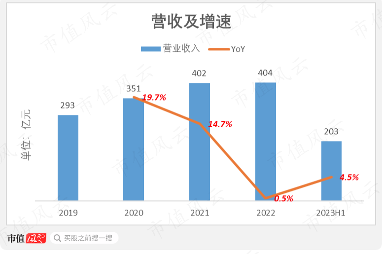 2023年上半年,营收203亿元,同比增速回升到4.5%。