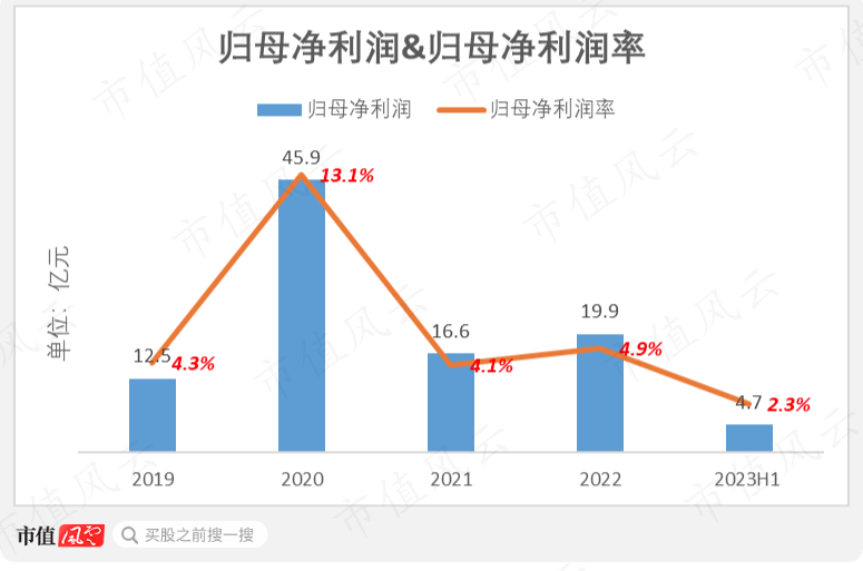 公司归母净利润率在2020年疫情期间触达13.1%的历史高位后下跌,2022年为4.9%。2023年上半年,归母净利润4.7亿元,归母净利润率2.3%。