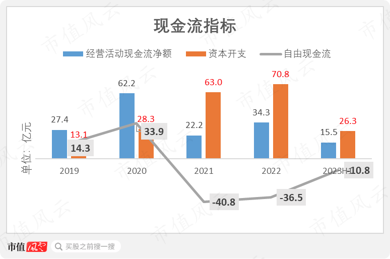 公司的经营现金流一直较为稳健,撇开2020年的逆天表现,其他年份每年都有二三十亿的现金净流入,2023年上半年为16亿元。