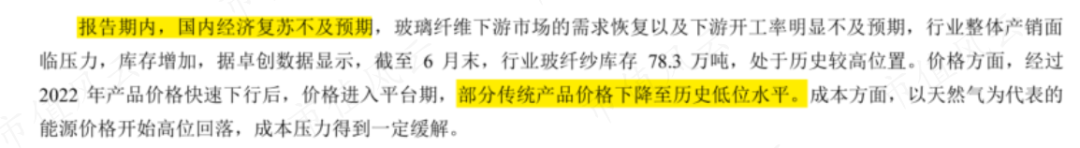 例如,中材科技表示:“2022年产品价格快速下行……部分传统产品价格下降至历史低位水平”。
