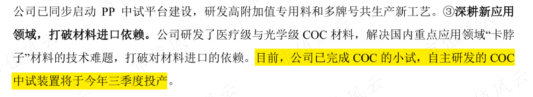 据披露,公司自主研发的医疗级与光学级COC材料,目前已完成小试,中试装置将于今年三季度投产,后续有望打破国内对该材料进口的依赖,解决“卡脖子”难题。