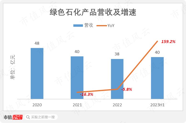 此外,公司绿色石化业务近期增长可观,2023年上半年营收40亿元,同比增159.2%,增速居各业务之首,并跃居为公司的第二大业务。