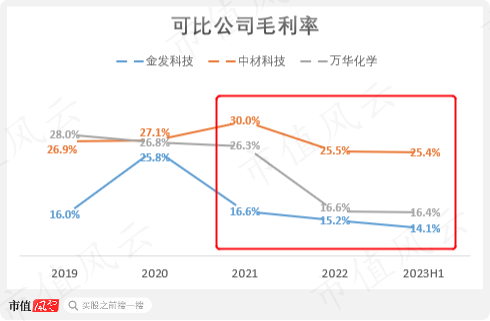 具体来看,2021年至今,三家企业的毛利率均呈现下滑,且中材科技和万华化学毛利率的整体跌幅,要明显大于公司。