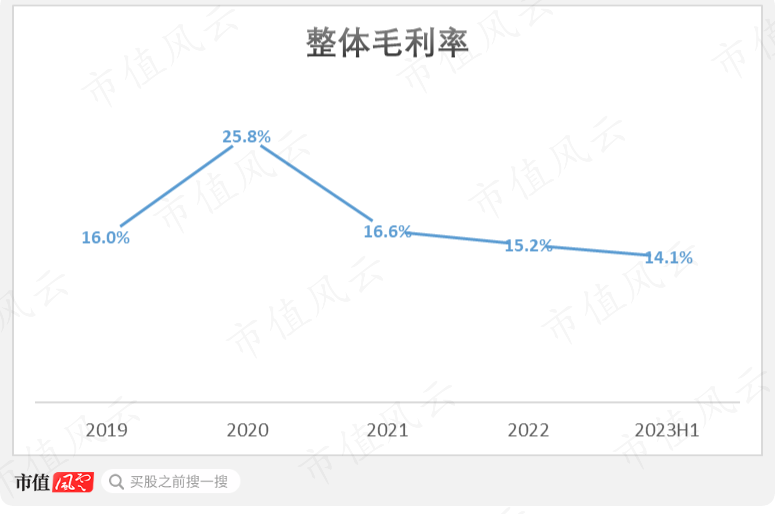 公司毛利率自2021年以来逐年下跌,2023年上半年,毛利率为14.1%。