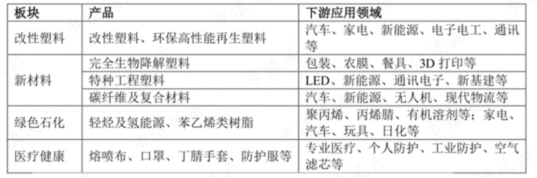 公司的主营业务主要包括改性塑料、新材料、绿色石化和医疗健康,产品广泛应用于汽车、家用电器、电子电工、通讯电子、新基建、新能源、现代农业、现代物流、轨道交通、航空航天、高端装备、医疗健康等。