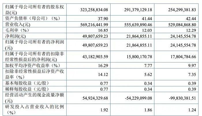 业绩方面,2021 年至 2023 年,能之光营业收入分别为 5.29 亿元、5.56 亿元、5.69 亿元,归属于母公司所有者的净利润分别为 2424.6 万元、2186.4 万元、4980.8 万元。报告期内,公司综合毛利率分别为 12.29%、12.03%和 16.85%。