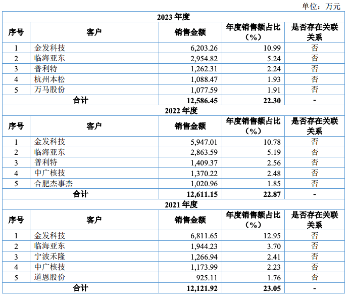 2023 年度,公司前五大客户为:金发科技、临海亚东、普利特、杭州本松,以及万马股份。