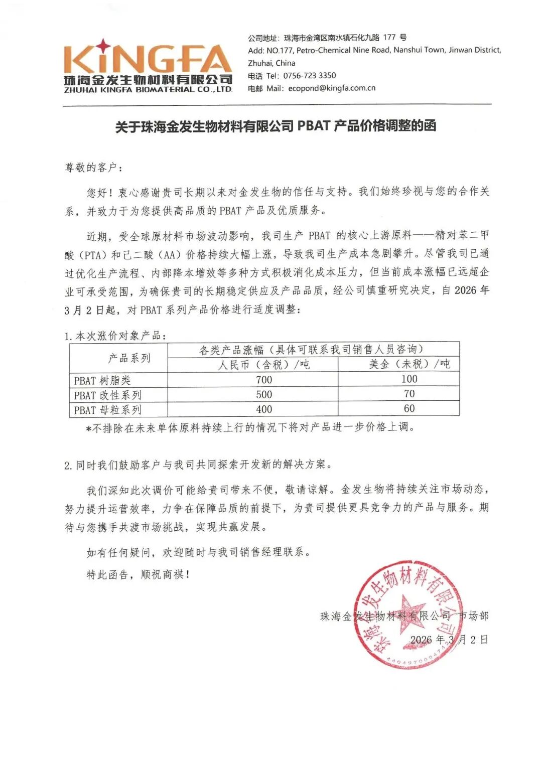 3月2日,珠海金发生物材料有限公司(金发科技子公司)发布PBAT产品价格调整函,受全球原材料市场波动影响,生产PBAT的核心上游原料--精对苯二甲酸(PTA)和己二酸(AA)价格持续大幅上涨,当前成本涨幅已远超企业可承受范围,自3月2日起,对PBAT系列产品价格进行价格调整: