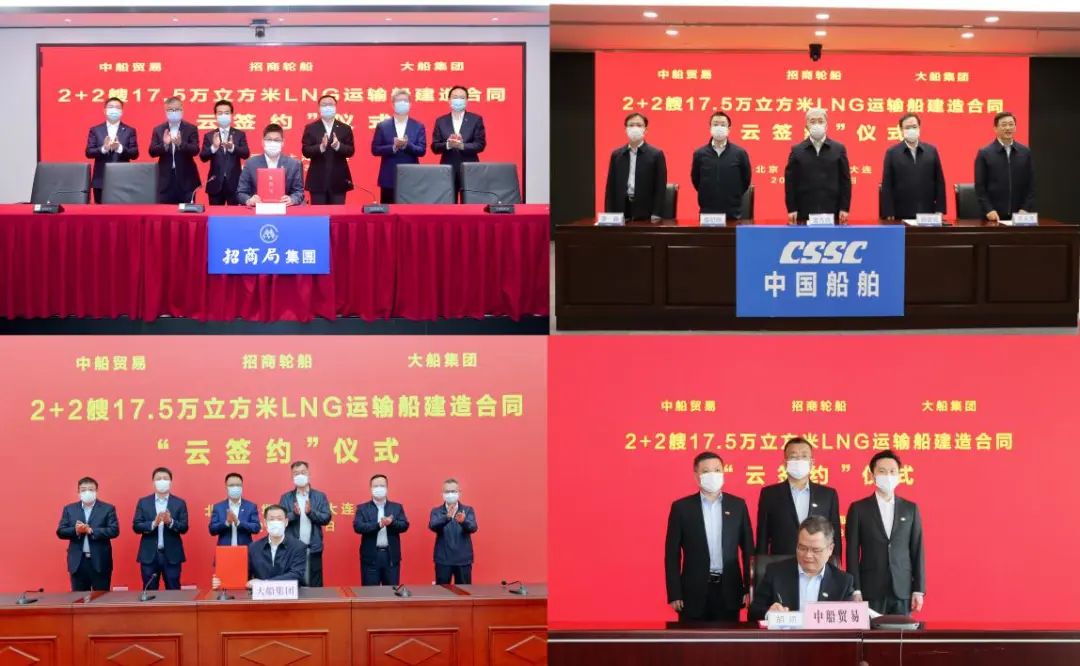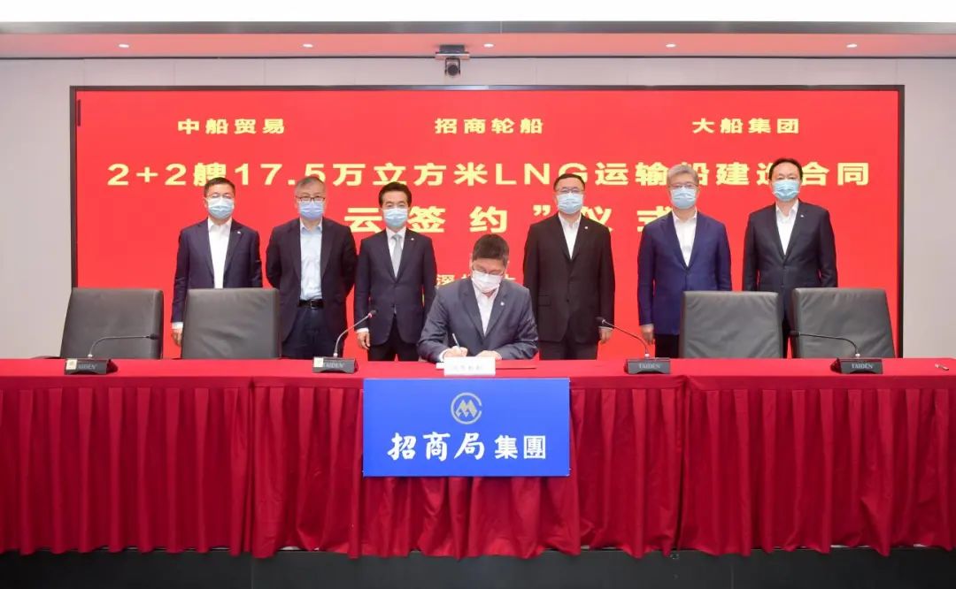 3月31日,招商局集团旗下招商轮船与中国船舶集团旗下大船集团、中船贸易在深圳、上海、大连、北京四地,通过“云签约”方式签署“2+2”艘大型液化天然气(LNG)运输船建造合同。招商局集团董事长缪建民、总经理胡建华、董事王宏与中国船舶集团董事长雷凡培、总经理杨金成、副总经理盛纪纲等见证签约。