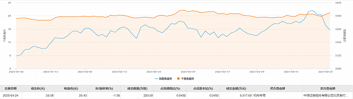 中国船舶4月24日大宗交易成交220万股,成交额5517.6万元,占当日总成交额的1.43%,成交价25.08元,较市场收盘价25.43元折价1.38%。