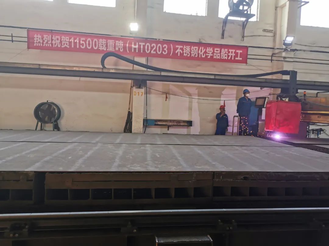 随着赵邦涛、顾思远、李祥泉3人共同启动开工点火按钮,第一块钢板开始切割,标志着川东造船承建的上海中远海运11500载重吨不锈钢化学品船正式开工建造。