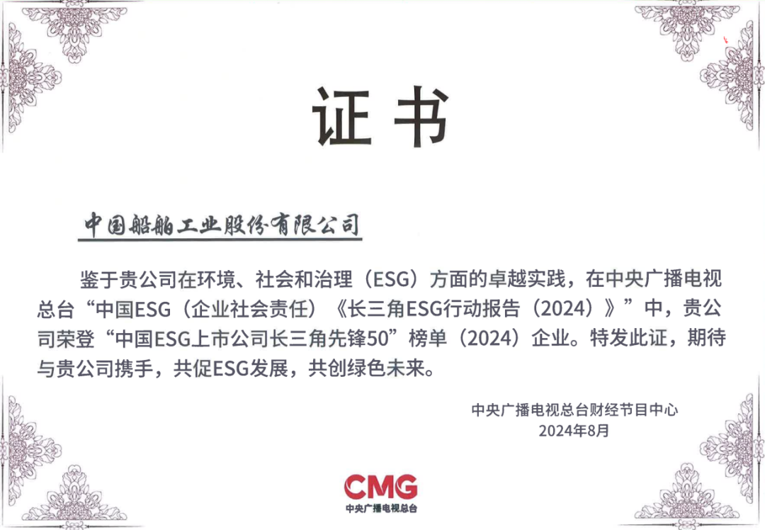 2024年8月7日,中央广播电视总台在上海举办“ESG中国·长三角企业社会责任发布会”,会上发布“中国ESG上市公司长三角先锋50(2024)”榜单,中国船舶股份凭借在环境、社会与治理(ESG)领域的卓越表现与突出贡献成功入选,为共促ESG发展、共创绿色未来增添“船舶动力”。该发布会由中国企业改革与发展研究会、上海市国资委、责任云研究院等主办。