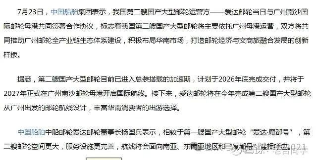 必须指出的是,国产大型邮轮爱达·魔都号就是中国船舶的作品,某个大佬还专门有过赞赏意见的表达。最新的消息是,中国船舶的第二艘大型邮轮已经开始在广州建造了。