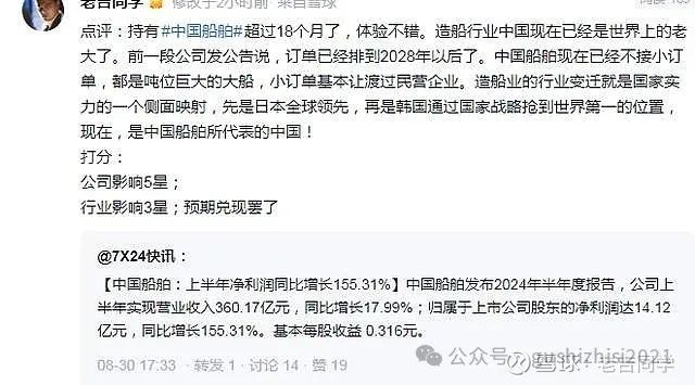 8月30点评中国船舶的中报业绩时普写到,全球造船行业中国企业群体已经是世界上领先的老大了。中国船舶今年5月30日发公告说,订单已经排到2028年了。中国船舶现在已经不接造船的小订单,只有吨位巨大、金额巨大的超级大船才会去,小订单小船都让渡给更多的民营企业。