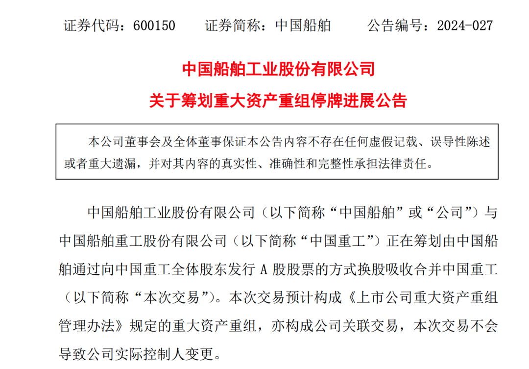 公告称,中国船舶与中国船舶重工股份有限公司(以下简称“中国重工”)正在筹划由中国船舶通过向中国重工全体股东发行 A股股票的方式换股吸收合并中国重工(以下简称“本次交易”)。本次交易预计构成《上市公司重大资产重组管理办法》规定的重大资产重组,亦构成公司关联交易,本次交易不会导致公司实际控制人变更。