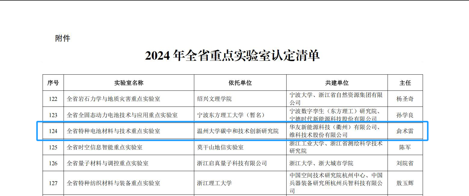 6月3日,浙江省科学技术厅发布了《关于公布2024年全省重点实验室认定结果的通知》,维科技术以共建单位申报的“全省特种电池材料与技术重点实验室”成功入选全省重点实验室名单。