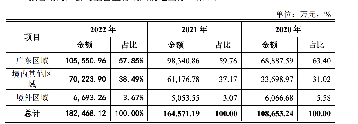 报告期内,侨益股份主营业务收入主要来自我国广东区域,收入占比分别为63.40%、59.76%和57.85%,并在广东拥有一定的区位优势。报告期内,公司紧贴市场,持续加大境内其他区域布局,除广东以外的境内其他区域收入占比从2020年31.02%提升至2022年38.49%。报告期内,公司境外收入主要来自美国农产品装卸、临时仓储等收入,占比分别为5.58%、3.07%、3.67%,占比较小。