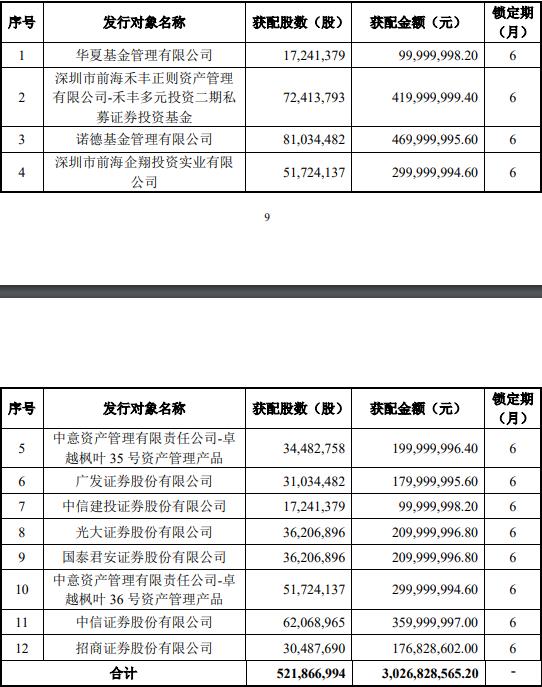华创阳安11月9日披露非公开发行股票发行情况报告书,确定此次发行价为5.8元/股,发行股数为5.21亿股,募集资金总额约30.27亿元。此次发行对象最终确定为12名。其中,诺德基金获配4.70亿元,禾丰多元投资二期获配4.20亿元,中信证券获配3.60亿元。
