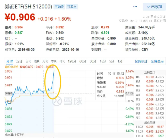 券商早盘触底回升后红盘震荡,临近午盘异动急拉,券商ETF(512000)场内价格现涨1.8%,成交额超2亿元。板块个股中,华创云信强势封板,首创证券涨逾8%,国联证券、中国银河涨超5%,华泰证券、中信证券等涨幅居前。