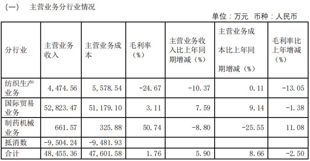 营收占比最高的国际贸易业务也仅仅是保持着微利状态。上半年收入达5.28亿元,同比增长7.59%,毛利率较去年同期下降1.38个百分点至3.11%。从以往年报来看,华升股份是一家外向型企业,产品85%以上外销,主要出口市场为欧盟、美国、韩国、日本及南美等国家和地区。