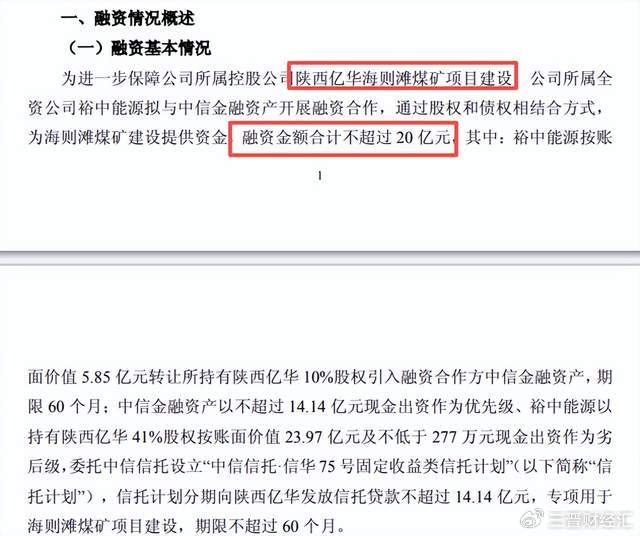 同日,公司宣布将采用“股权+债权”结合的融资模式,为核心项目海则滩煤矿募集不超过20亿元资金。