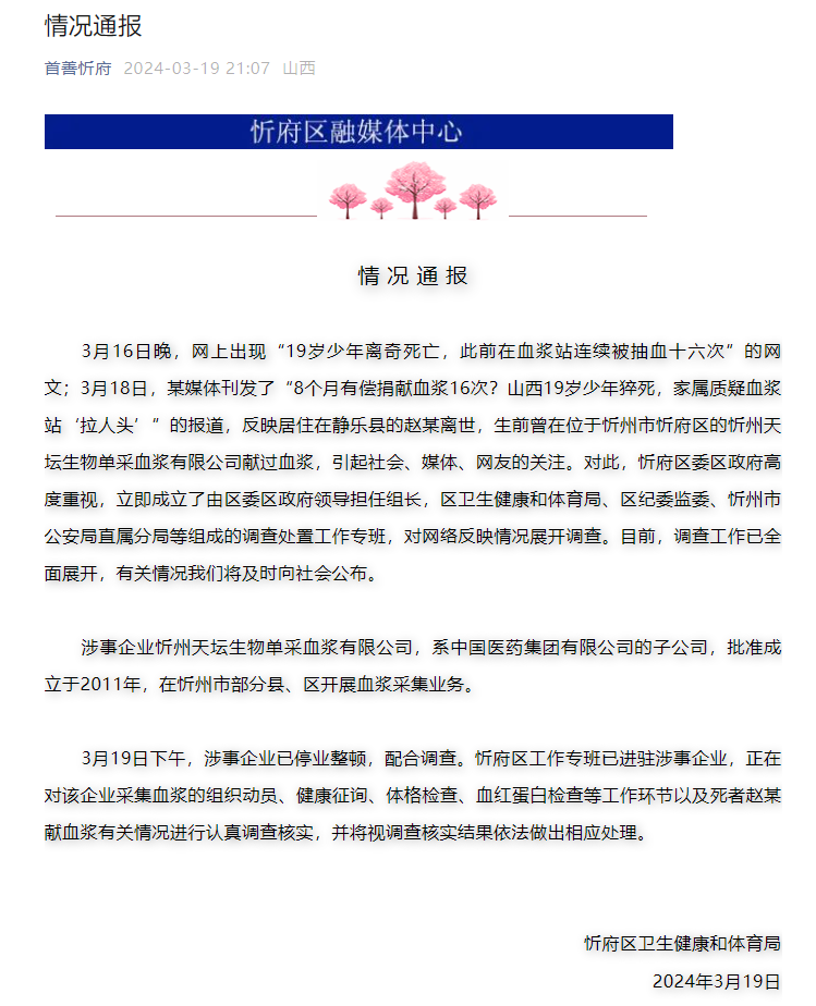上述情况通报还提到,涉事企业忻州天坛生物单采血浆有限公司(以下简称“忻州天坛生物”),系中国医药集团有限公司的子公司。3月19日下午,涉事企业已停业整顿,配合调查。忻府区工作专班已进驻涉事企业,正在对该企业采集血浆的组织动员、健康征询、体格检查、血红蛋白检查等工作环节以及死者赵某献血浆有关情况进行认真调查核实,并将视调查核实结果依法做出相应处理。
