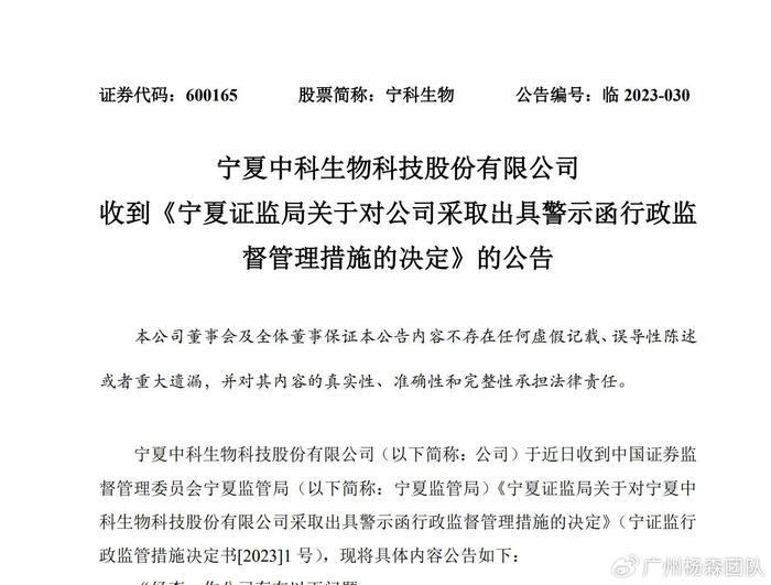 宁夏监管局指出宁科生物存在三项违法披露行为,对宁科生物采取警示函的监督管理措施。