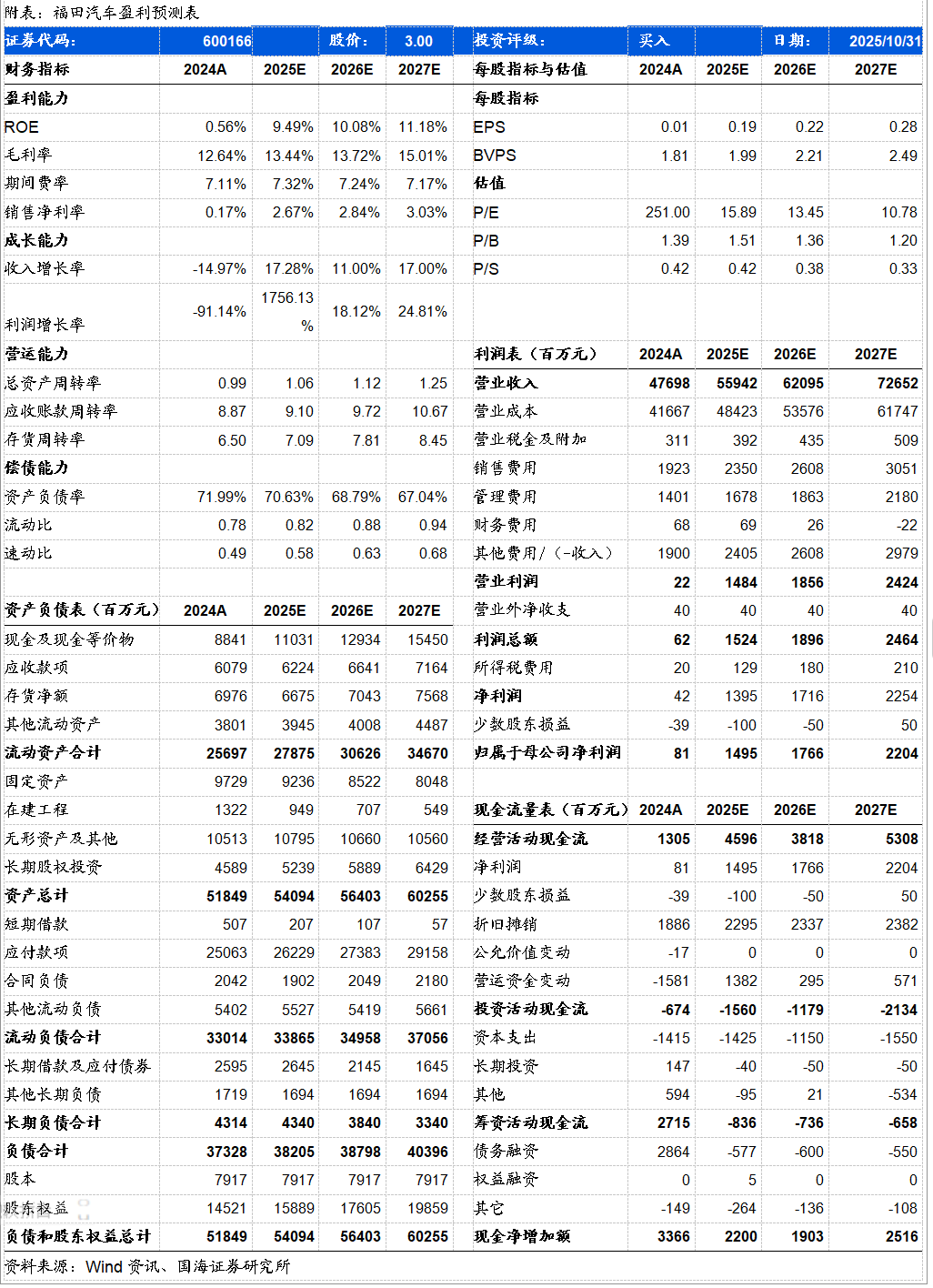 福田汽车-盈利预测表: