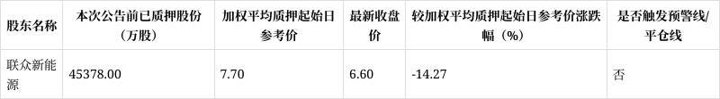 截止本公告日前,联众新能源已经累计质押4.54亿股,加权平均质押起始日参考股价为7.70元/股,其质押预警线(预估)为6.47元/股,质押平仓线(预估)为5.66元/股。公司最近一个交易日的收盘价为6.60元/股,较加权平均质押起始日参考股价涨跌幅为-14.27%。