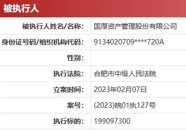 中国执行信息公开网显示,国厚资产管理股份有限公司被合肥市中级人民法院列为被执行人,执行标的199097300元,立案时间2023年2月7日,案号为(2023)皖01执127号。
