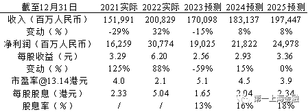 我们预计2023年随着入冬季进入煤炭需求旺季,市场煤价格将有望保持高位。根据香港会计准则,公司港股23年利润将并入鲁西和新疆能化Q4的利润,未来三年新疆五彩湾煤矿将逐年释放产能,因此调整2023/2024/2025归母净利润分别为190.3/ 218.2/249.8亿元;EPS分别为2.56/2.93/3.36元。估值方面,对应公司24年净利润参考行业平均7倍PE,给与公司买入评级,目标价为22港元。