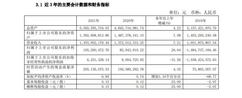 近日,泉阳泉公布2021年年度报告,公司实现营业收入14.71亿元,同比增长7.21%。归属于上市公司股东的净利润1.05亿元,同比增长26.94%;归属于上市公司股东的扣除非经常性损益的净利润625.13万元,同比下降31.26%;基本每股收益0.15元。