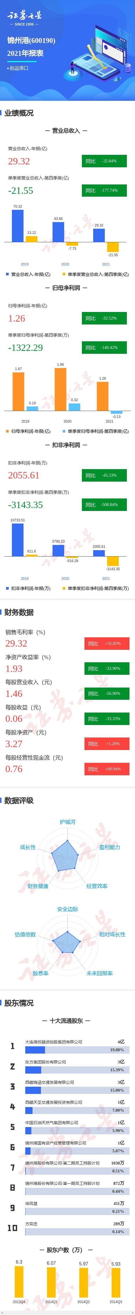 锦州港2021年报显示,公司主营收入29.33亿元,同比下降32.84%;归母净利润1.26亿元,同比下降32.52%;扣非净利润2055.62万元,同比下降45.33%;其中2021年第四季度,公司单季度主营收入-215511.61万元,同比下降177.74%;单季度归母净利润-1322.3万元,同比下降140.42%;单季度扣非净利润-3143.35万元,同比下降508.84%;负债率63.9%,投资收益5182.18万元,财务费用5.35亿元,毛利率29.32%。